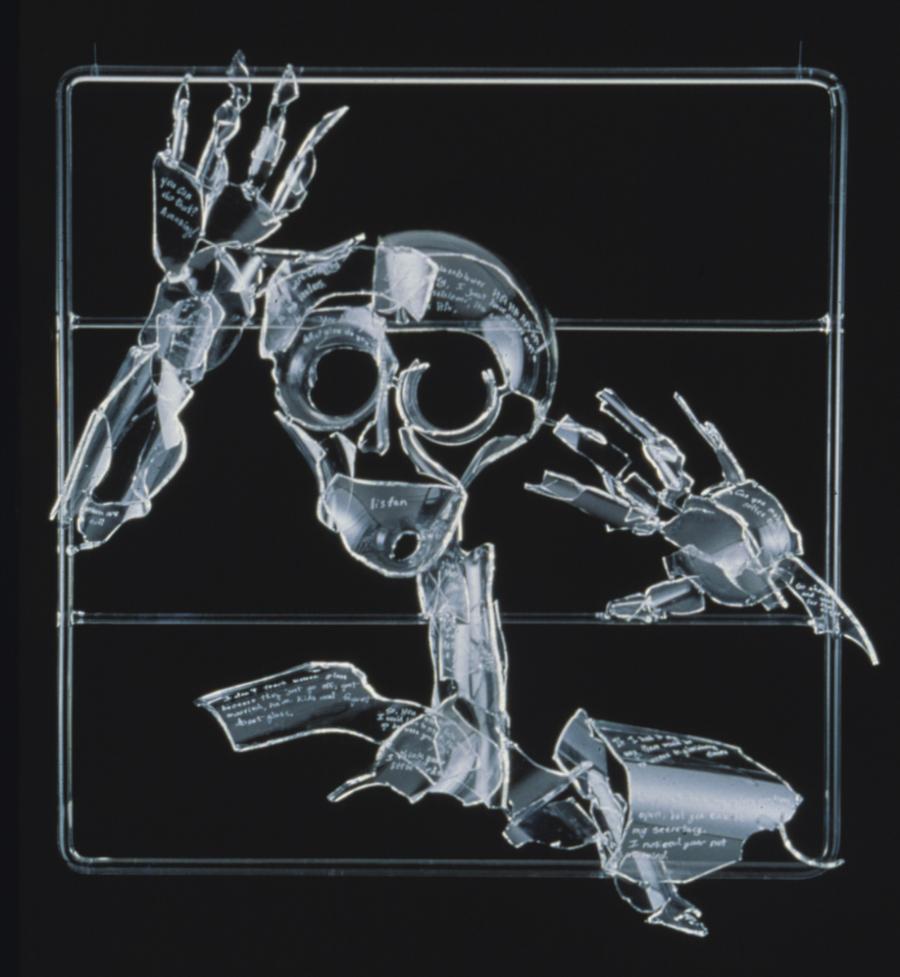 This is a life size self-portrait with engraved comments made by male glassblowers to me that shattered my soul
